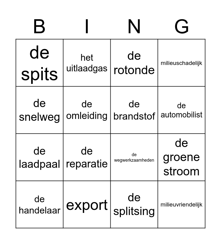 This bingo card has 20 words: de groene stroom, import, de rotonde, het asfalt, de handelaar, de snelweg, export, de spits, de laadpaal, het uitlaadgas, de reparatie, de wegwerkzaamheden, de omleiding, milieuvriendelijk, de brandstof, het kruispunt, de automobilist, milieuschadelijk, de splitsing and de bushalte.