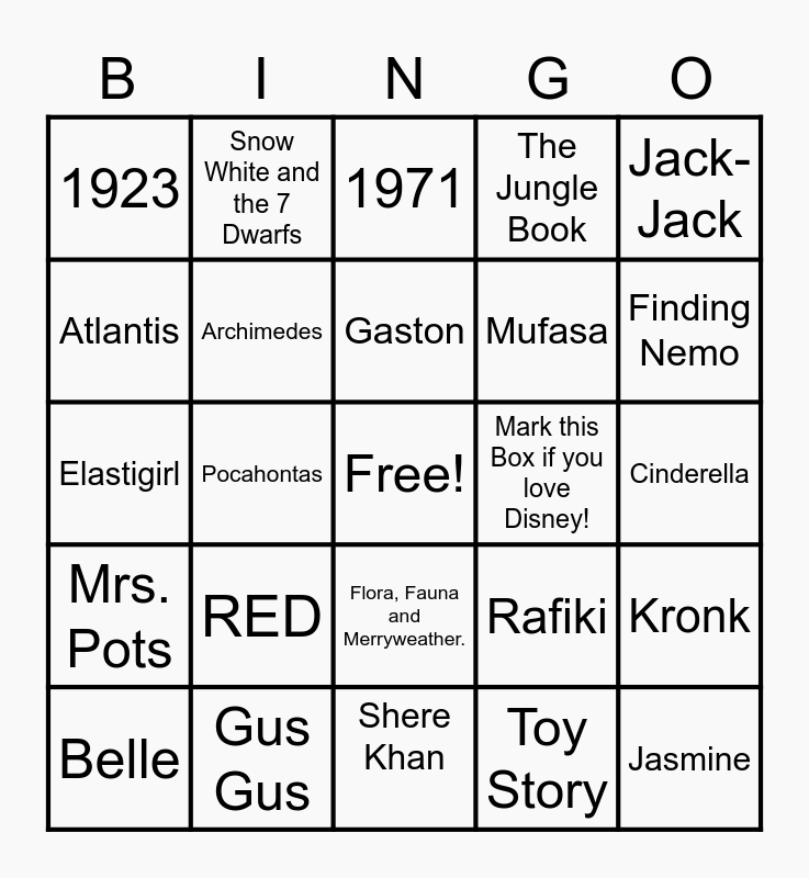This bingo card has a free space and 34 words: We Don't Talk about Who? (Post Answer in WFM Chat to get this box), Toy Story, Fox and the Hound, Little Girl Squirrel, Mrs. Pots, Archimedes, Jack- Jack, Belle, Snow White and the 7 Dwarfs, What is the Dogs Name in the Movie UP? (Post Gif/ Answer in WFM Chat), Gaston, 1971, Lucifer, Peter Pan, Mark this Box if you love Disney!, Finding Nemo, Gus Gus, Elastigirl, RED, Rafiki, Flora, Fauna and Merryweather., Olaf, 1923, Cinderella, Shere Khan, Jasmine, The Jungle Book, Rajah, Mufasa, Atlantis, AristoCats, Pocahontas, Kronk and The Little Mermaid.