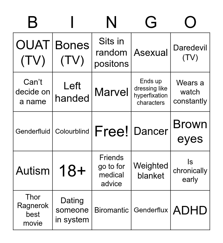 This bingo card has a free space and 24 words: 18+, Dating someone in system, Marvel, Thor Ragnerok best movie, Daredevil (TV), OUAT (TV), Can’t decide on a name, Bones (TV), Dancer, Friends go to for medical advice, Ends up dressing like hyperfixation characters, Genderfluid, Weighted blanket, Is chronically early, Left handed, Genderflux, Brown eyes, Sits in random positons, Wears a watch constantly, Colourblind, ADHD, Autism, Asexual and Biromantic.