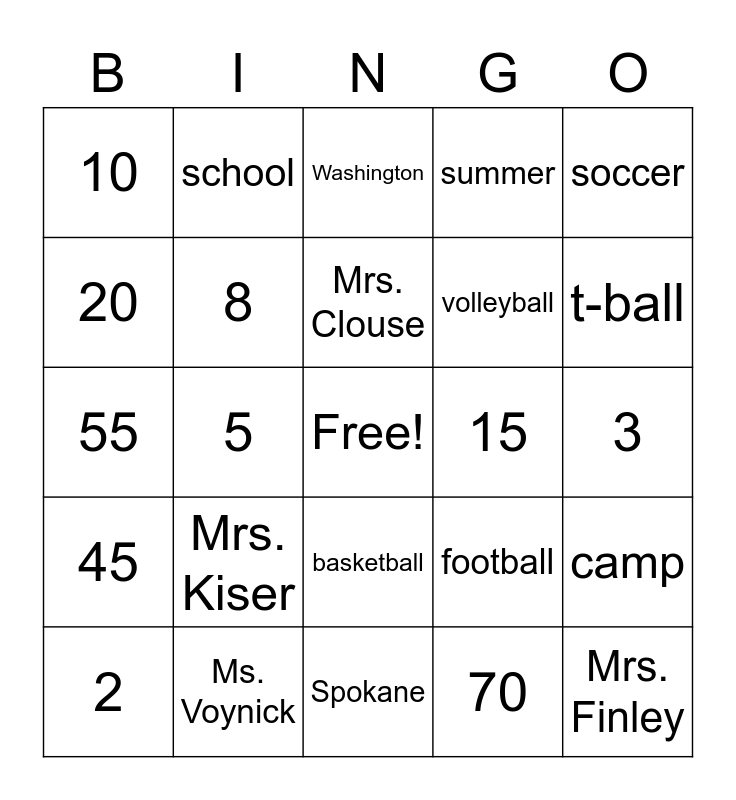 This bingo card has a free space and 29 words: 2, Harrington, 5, Davenport, 10, Washington, 8, Mrs. Kiser, 15, Ms. Voynick, 3, Mrs. Finley, Spokane, 70, t-ball, 16, basketball, 45, soccer, 55, football, 6, volleyball, 20, summer, school, camp, Mrs. Clouse and Mrs. Schultz.