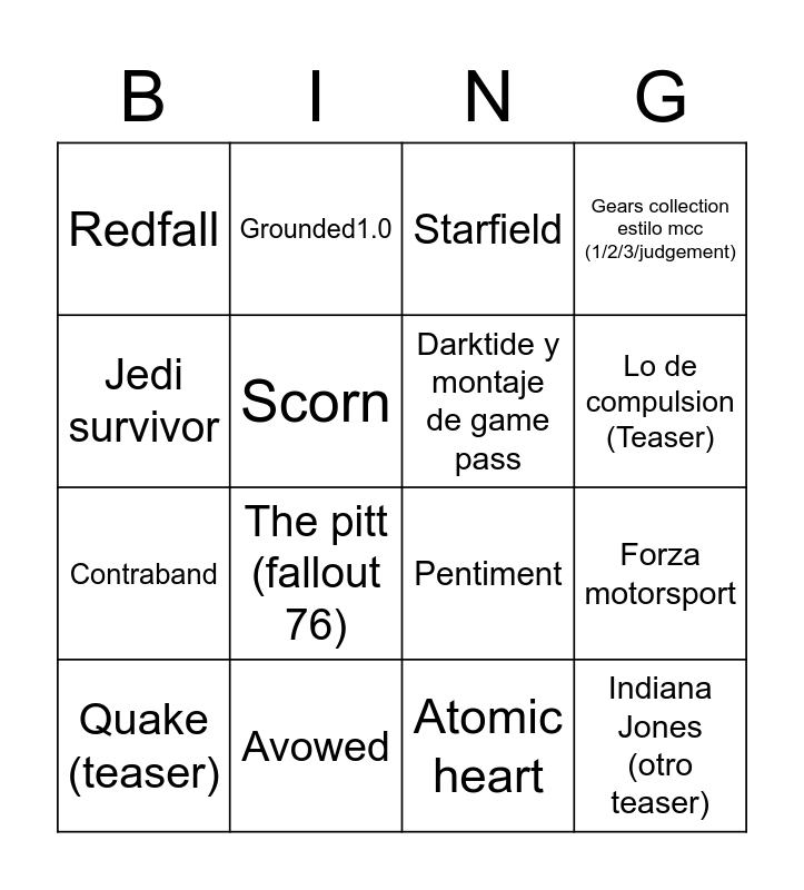 This bingo card has 16 words: Avowed, Forza motorsport, Starfield, Redfall, Contraband, Grounded1.0, Pentiment, Atomic heart, Jedi survivor, Scorn, Quake (teaser), Gears collection estilo mcc (1/2/3/judgement), The pitt (fallout 76), Lo de compulsion (Teaser), Darktide y montaje de game pass and Indiana Jones (otro teaser).
