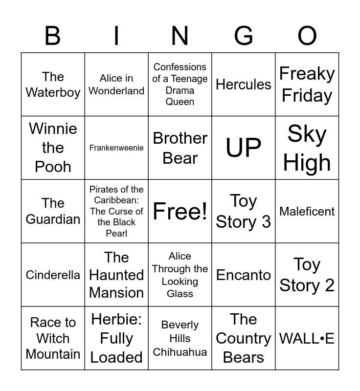 This bingo card has a free space and 29 words: Race to Witch Mountain, Frozen 2, Pirates of the Caribbean: The Curse of the Black Pearl, Cheaper by the Dozen, The Waterboy, Confessions of a Teenage Drama Queen, Frankenweenie, The Haunted Mansion, Toy Story 3, Herbie: Fully Loaded, Maleficent, WALL•E, Beverly Hills Chihuahua, The Country Bears, Sky High, Tron: Legacy, Alice Through the Looking Glass, Cinderella, Freaky Friday, The Guardian, Encanto, Chicken Little, UP, Winnie the Pooh, Hercules, Alice in Wonderland, Toy Story 2, Brother Bear and Pirates of the Caribbean: Dead Men Tell No Tales.