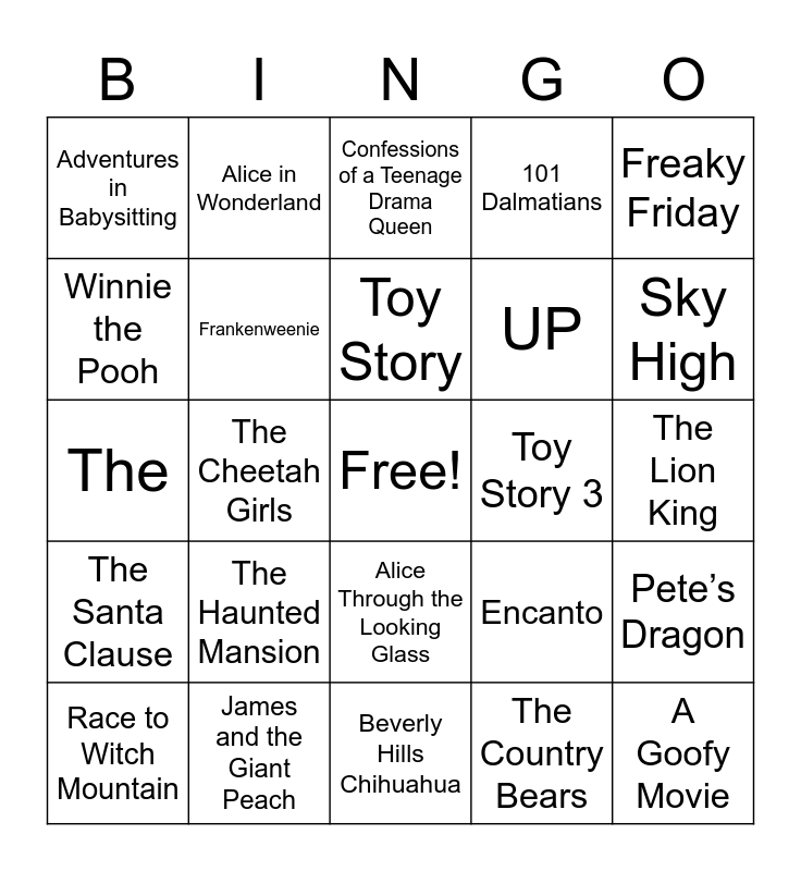 This bingo card has a free space and 29 words: Race to Witch Mountain, Frozen 2, The Cheetah Girls, Cheaper by the Dozen, Adventures in Babysitting, Confessions of a Teenage Drama Queen, Frankenweenie, The Haunted Mansion, Toy Story 3, James and the Giant Peach, The Lion King, A Goofy Movie, Beverly Hills Chihuahua, The Country Bears, Sky High, Tron: Legacy, Alice Through the Looking Glass, The Santa Clause, Freaky Friday, The, Encanto, Chicken Little, UP, Winnie the Pooh, 101 Dalmatians, Alice in Wonderland, Pete’s Dragon, Toy Story and The Fox and the Hound.