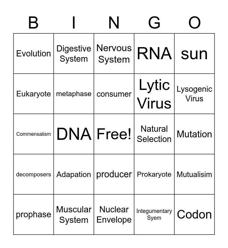 This bingo card has a free space and 39 words: interphase, telophase, anaphase, metaphase, prophase, producer, consumer, energy, sun, decomposers, DNA, RNA, Codon, Mutation, Natural Selection, Adapation, Fitness, Evolution, Claydogram, Prokaryote, Eukaryote, Nuclear Envelope, Lytic Virus, Lysogenic Virus, Secondary Consumer, Immune System, Respiratory system, Endocrine System, Skeletal System, Digestive System, Excretory System, Circulatory System, Nervous System, Muscular System, Integumentary Syem, Reproductive System, Mutualisim, Commensalism and Parasitic.
