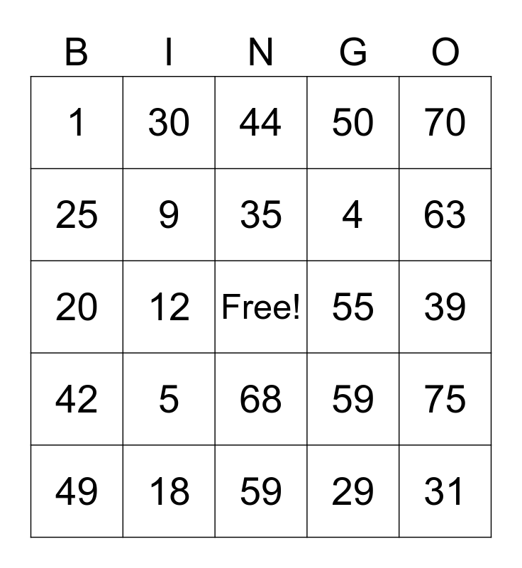 This bingo card has a free space and 24 words: 5, 18, 35, 49, 70, 1, 25, 30, 55, 68, 4, 20, 59, 75, 9, 29, 39, 44, 63, 12, 31, 42, 50 and 59.