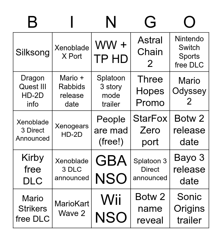 This bingo card has a free space and 24 words: Xenoblade 3 DLC announced, MarioKart Wave 2, Splatoon 3 story mode trailer, Mario Strikers free DLC, Nintendo Switch Sports free DLC, Silksong, Dragon Quest III HD-2D info, Xenoblade X Port, StarFox Zero port, GBA NSO, Three Hopes Promo, Xenoblade 3 Direct Announced, Splatoon 3 Direct announced, Bayo 3 release date, Mario + Rabbids release date, Botw 2 name reveal, Botw 2 release date, WW + TP HD, Mario Odyssey 2, Xenogears HD-2D, Sonic Origins trailer, Kirby free DLC, Astral Chain 2 and Wii NSO.