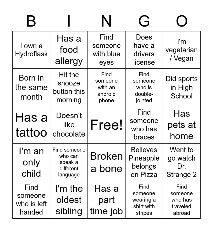 This bingo card has a free space and 24 words: Find someone who can speak a different language, I'm the oldest sibling, Find someone with an android phone, Find someone who is left handed, I'm vegetarian / Vegan, I own a Hydroflask, Born in the same month, Has a food allergy, Find someone who has braces, Broken a bone, Find someone who is double-jointed, Has a tattoo, Believes Pineapple belongs on Pizza, Went to go watch Dr. Strange 2, Hit the snooze button this morning, Find someone wearing a shirt with stripes, Has pets at home, Find someone with blue eyes, Did sports in High School, Doesn't like chocolate, Find someone who has traveled abroad, I'm an only child, Does have a drivers license and Has a part time job.