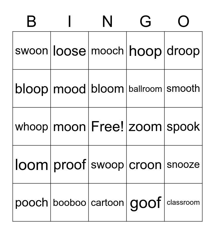 This bingo card has a free space and 24 words: pooch, proof, bloom, goof, droop, swoon, loose, mooch, zoom, spook, whoop, mood, croon, snooze, bloop, booboo, cartoon, hoop, smooth, loom, moon, swoop, ballroom and classroom.