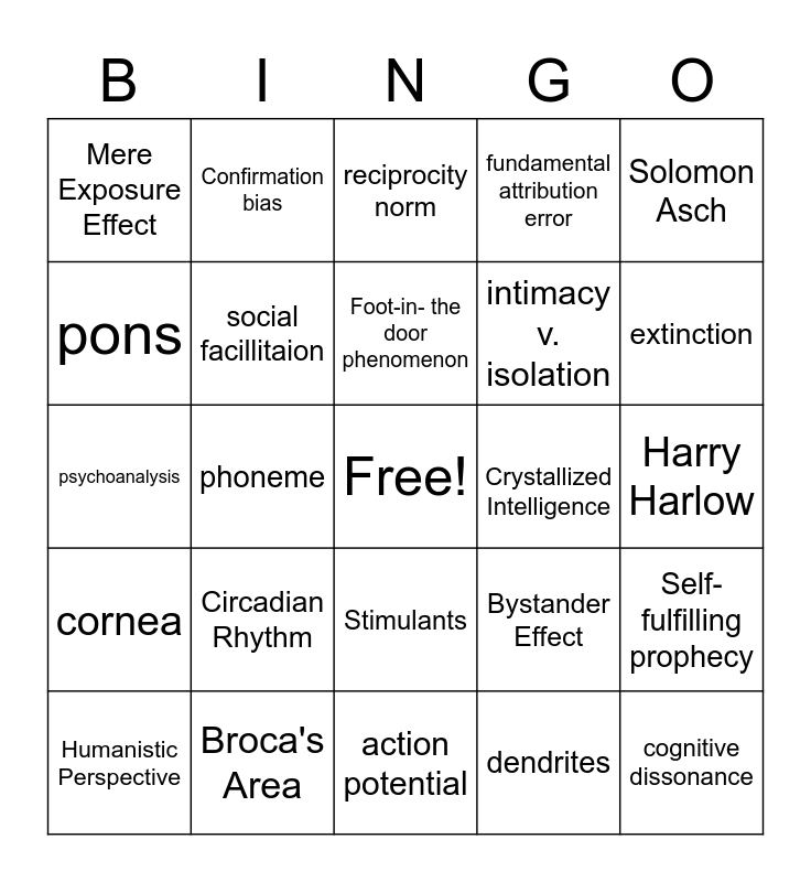 This bingo card has a free space and 24 words: Circadian Rhythm, Broca's Area, Foot-in- the door phenomenon, Humanistic Perspective, Solomon Asch, Mere Exposure Effect, pons, Confirmation bias, Crystallized Intelligence, Stimulants, intimacy v. isolation, psychoanalysis, Bystander Effect, Self-fulfilling prophecy, social facillitaion, dendrites, Harry Harlow, reciprocity norm, extinction, phoneme, cognitive dissonance, cornea, fundamental attribution error and action potential.