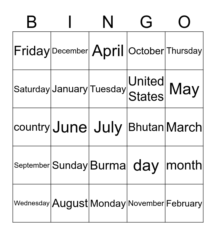 This bingo card has 25 words: Sunday, Monday, Tuesday, Wednesday, Thursday, Friday, Saturday, December, Bhutan, Burma, United States, country, day, month, January, February, March, April, May, June, July, August, September, October and November.