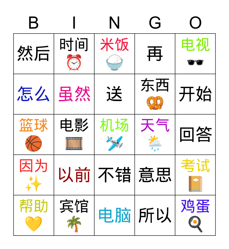 This bingo card has a free space and 24 words: 以前, 宾馆 🌴, 送, 帮助 💛, 电视 🕶, 然后, 怎么, 时间 ⏰, 天气 🌦, 不错, 东西 🥨, 篮球 🏀, 意思, 考试 📔, 虽然, 所以, 回答, 米饭🍚, 开始, 电影 🎞, 鸡蛋🍳, 因为 ✨, 再 and 电脑.