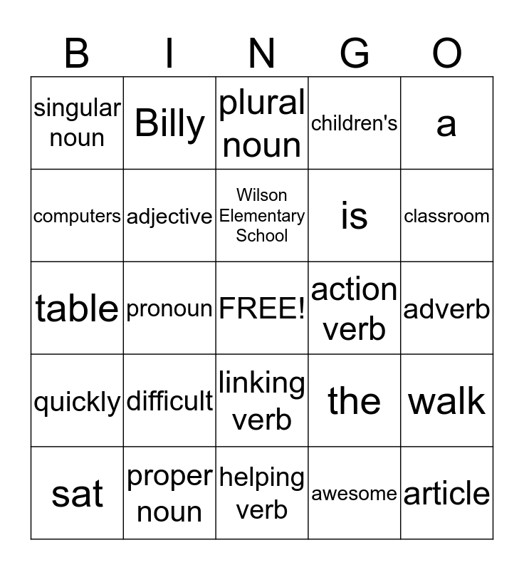 This bingo card has a free space and 30 words: proper noun, common noun, pronoun, possessive noun, singular noun, plural noun, adjective, linking verb, action verb, helping verb, adverb, article, awesome, Mr. Renzelmann, classroom, jumped, the, quickly, difficult, a, table, dog, Billy, is, computers, children's, walk, sat, Wilson Elementary School and girl.
