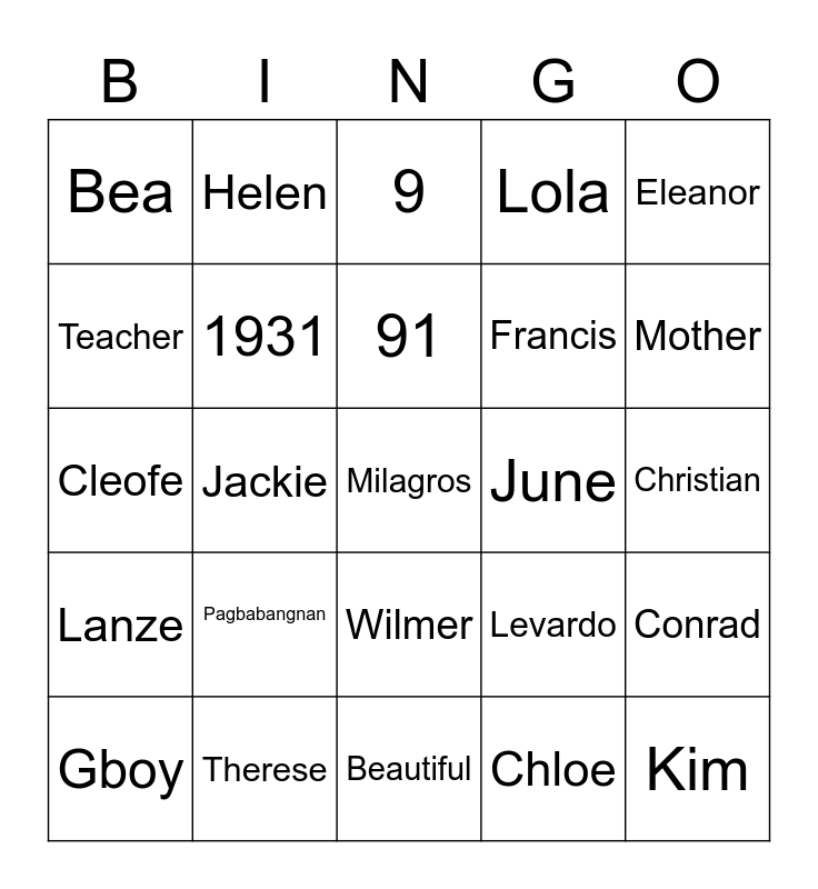 This bingo card has a free space and 24 words: Pagbabangnan, Therese, 91, Gboy, Eleanor, Bea, Teacher, Helen, June, Wilmer, Francis, Cleofe, Levardo, Conrad, 1931, Chloe, Christian, 9, Mother, Jackie, Kim, Lanze, Lola and Beautiful.