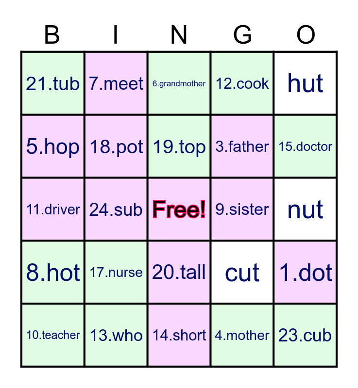 This bingo card has a free space and 28 words: 1.dot, 2.brother, 3.father, 4.mother, 5.hop, 6.grandmother, 7.meet, 8.hot, 9.sister, 10.teacher, 11.driver, 12.cook, 13.who, 14.short, 15.doctor, 16.mop, 17.nurse, 18.pot, 19.top, 20.tall, 21.tub, 22.student, 23.cub, 24.sub, nut, cut, hut and later.