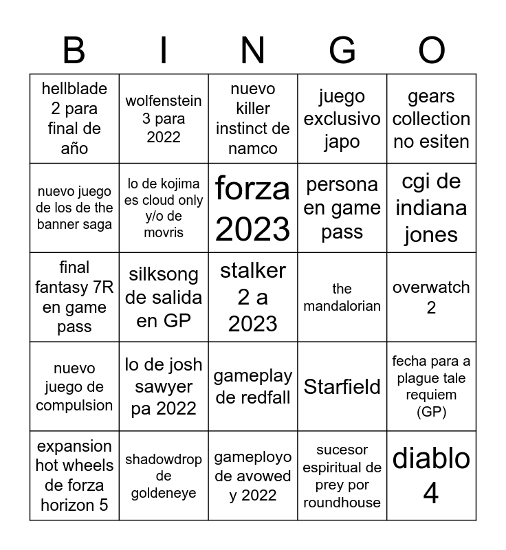 This bingo card has 25 words: lo de josh sawyer pa 2022, gameployo de avowed y 2022, forza 2023, expansion hot wheels de forza horizon 5, gears collection no esiten, hellblade 2 para final de año, nuevo juego de los de the banner saga, wolfenstein 3 para 2022, the mandalorian, gameplay de redfall, persona en game pass, final fantasy 7R en game pass, Starfield, fecha para a plague tale requiem (GP), lo de kojima es cloud only y/o de movris, diablo 4, overwatch 2, nuevo killer instinct de namco, cgi de indiana jones, silksong de salida en GP, stalker 2 a 2023, shadowdrop de goldeneye, nuevo juego de compulsion, juego exclusivo japo and sucesor espiritual de prey por roundhouse.
