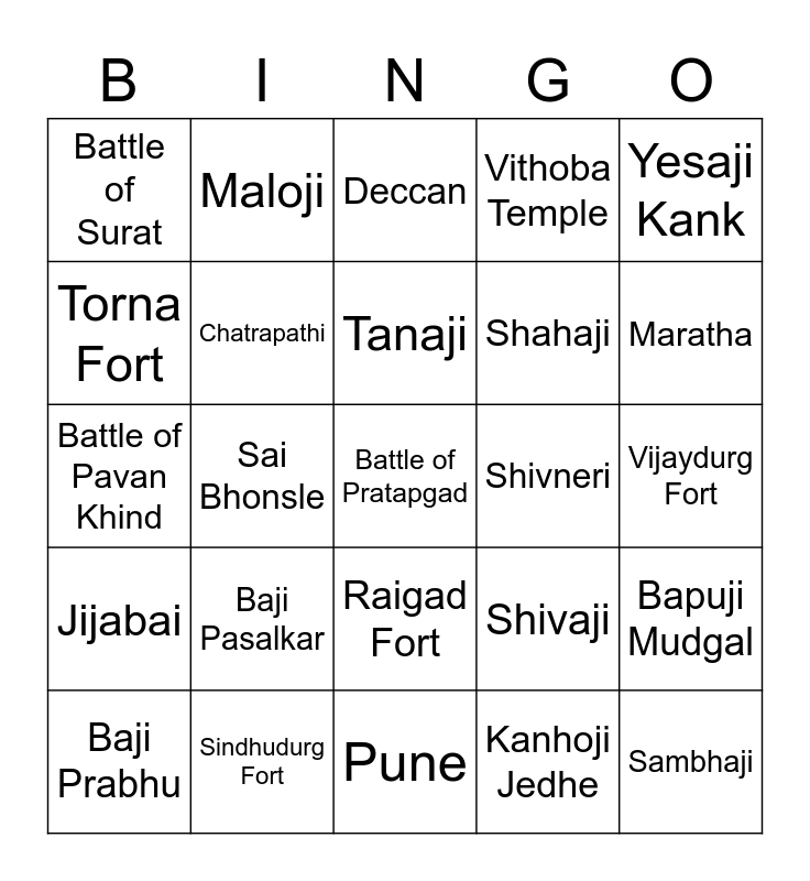 This bingo card has 25 words: Baji Pasalkar, Pune, Tanaji, Baji Prabhu, Yesaji Kank, Battle of Surat, Torna Fort, Maloji, Shivneri, Raigad Fort, Shahaji, Battle of Pavan Khind, Shivaji, Bapuji Mudgal, Chatrapathi, Sambhaji, Vijaydurg Fort, Deccan, Maratha, Sai Bhonsle, Battle of Pratapgad, Sindhudurg Fort, Jijabai, Vithoba Temple and Kanhoji Jedhe.