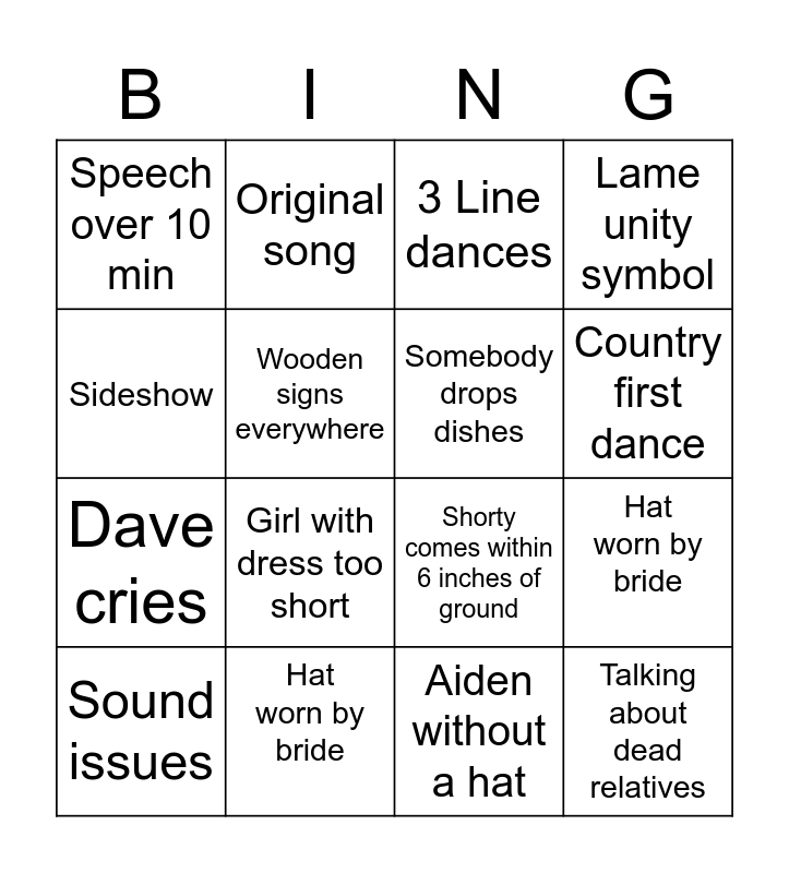 This bingo card has 16 words: Hat worn by bride, Hat worn by bride, 3 Line dances, Speech over 10 min, Dave cries, Original song, Shorty comes within 6 inches of ground, Aiden without a hat, Sideshow, Wooden signs everywhere, Sound issues, Lame unity symbol, Girl with dress too short, Country first dance, Somebody drops dishes and Talking about dead relatives.