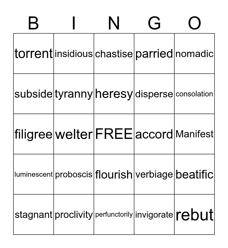 This bingo card has a free space and 24 words: proboscis, proclivity, heresy, stagnant, nomadic, torrent, subside, insidious, accord, flourish, disperse, filigree, verbiage, beatific, tyranny, invigorate, Manifest, chastise, consolation, welter, rebut, luminescent, parried and perfunctorily.