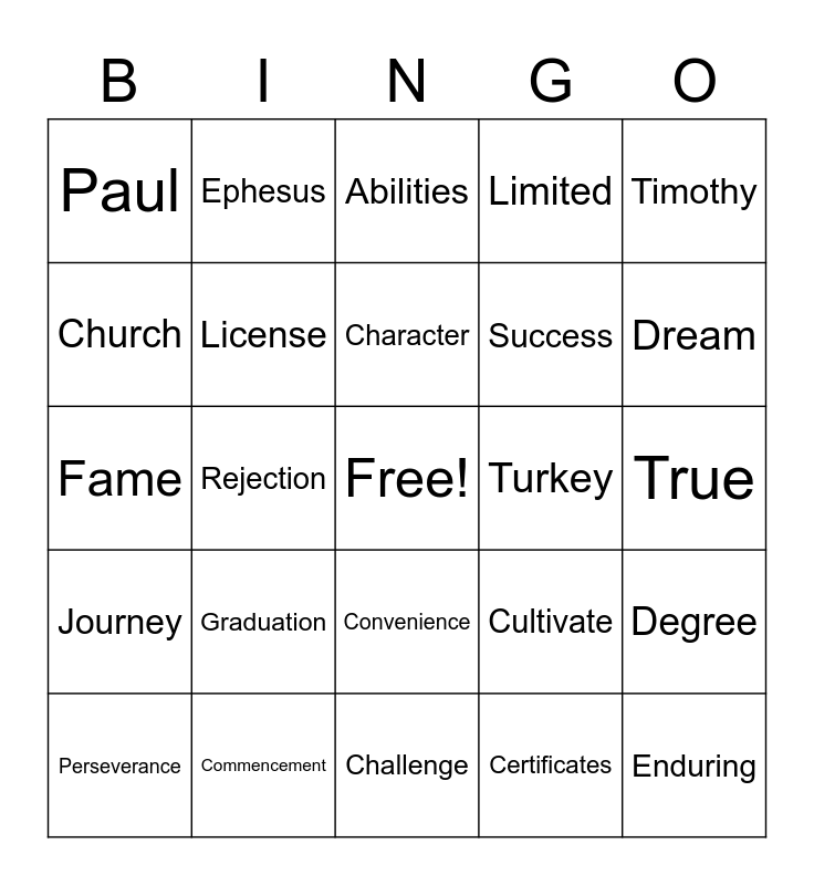 This bingo card has a free space and 24 words: Graduation, Commencement, Character, Perseverance, Timothy, Paul, Church, Ephesus, Turkey, Convenience, Success, Fame, Cultivate, Degree, License, Certificates, True, Abilities, Dream, Rejection, Enduring, Journey, Limited and Challenge.