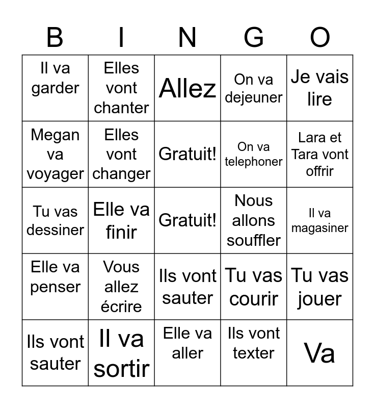 This bingo card has a free space and 24 words: Vous allez écrire, Il va sortir, Gratuit!, Ils vont sauter, Je vais lire, Il va garder, Megan va voyager, Elles vont chanter, Nous allons souffler, Ils vont sauter, On va telephoner, Tu vas dessiner, Tu vas courir, Tu vas jouer, Elles vont changer, Ils vont texter, Il va magasiner, Allez, Lara et Tara vont offrir, Elle va finir, Va, Elle va penser, On va dejeuner and Elle va aller.