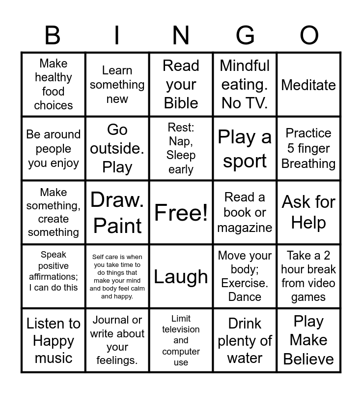 This bingo card has a free space and 24 words: Self care is when you take time to do things that make your mind and body feel calm and happy., Journal or write about your feelings., Rest: Nap, Sleep early, Listen to Happy music, Meditate, Make healthy food choices, Be around people you enjoy, Learn something new, Read a book or magazine, Laugh, Play a sport, Make something, create something, Move your body; Exercise. Dance, Take a 2 hour break from video games, Go outside. Play, Drink plenty of water, Ask for Help, Read your Bible, Practice 5 finger Breathing, Draw. Paint, Play Make Believe, Speak positive affirmations; I can do this, Mindful eating. No TV. and Limit television and computer use.