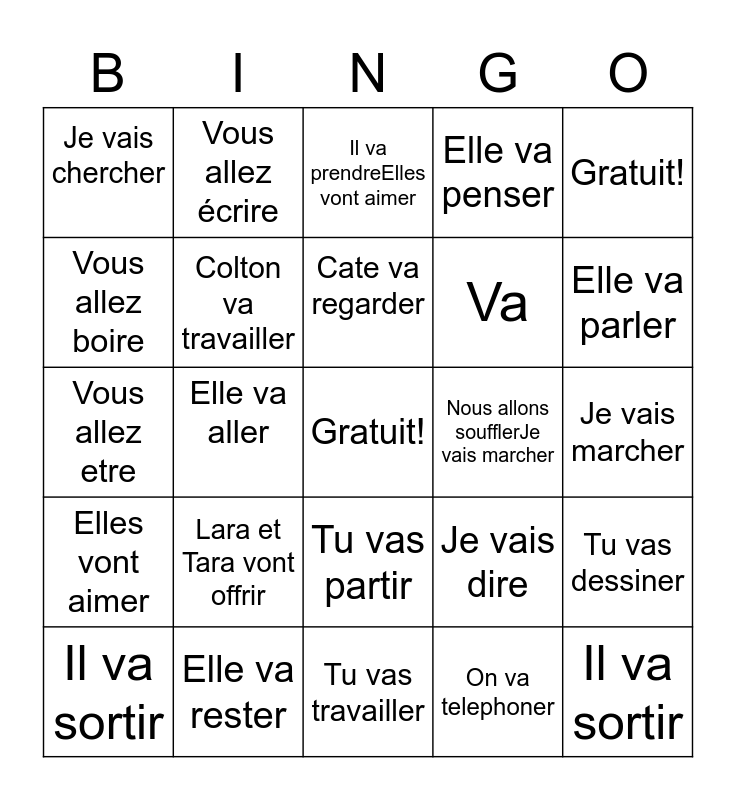 This bingo card has a free space and 24 words: Lara et Tara vont offrir, Elle va rester, Cate va regarder, Il va sortir, Gratuit!, Je vais chercher, Vous allez boire, Vous allez écrire, Nous allons soufflerJe vais marcher, Tu vas partir, Va, Vous allez etre, Je vais dire, Tu vas dessiner, Colton va travailler, On va telephoner, Je vais marcher, Il va prendreElles vont aimer, Elle va parler, Elle va aller, Il va sortir, Elles vont aimer, Elle va penser and Tu vas travailler.