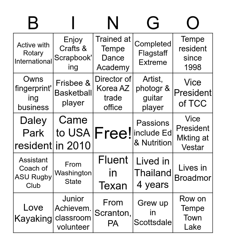 This bingo card has a free space and 24 words: From Washington State, Junior Achievem. classroom volunteer, Director of Korea AZ trade office, Love Kayaking, Tempe resident since 1998, Active with Rotary International, Owns fingerprint' ing business, Enjoy Crafts & Scrapbook' ing, Passions include Ed & Nutrition, Fluent in Texan, Artist, photogr & guitar player, Daley Park resident, Lived in Thailand 4 years, Lives in Broadmor, Frisbee & Basketball player, Grew up in Scottsdale, Vice President Mkting at Vestar, Trained at Tempe Dance Academy, Vice President of TCC, Came to USA in 2010, Row on Tempe Town Lake, Assistant Coach of ASU Rugby Club, Completed Flagstaff Extreme and From Scranton, PA.