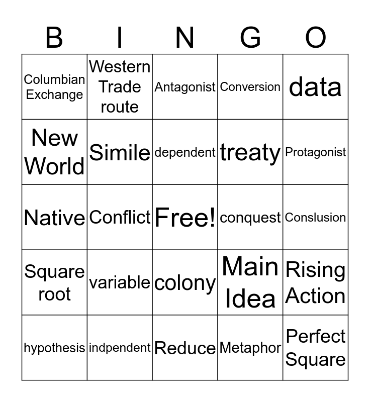 This bingo card has a free space and 24 words: variable, indpendent, dependent, hypothesis, data, Columbian Exchange, New World, Western Trade route, conquest, colony, treaty, Native, Main Idea, Rising Action, Simile, Metaphor, Conslusion, Antagonist, Protagonist, Conflict, Perfect Square, Square root, Conversion and Reduce.