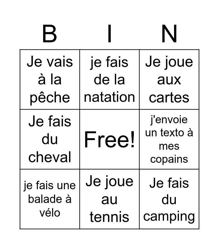 This bingo card has a free space and 8 words: j'envoie un texto à mes copains, Je joue aux cartes, je fais de la natation, je fais une balade à vélo, Je vais à la pêche, Je fais du camping, Je fais du cheval and Je joue au tennis.