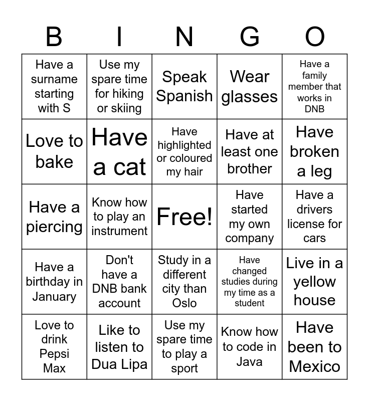 This bingo card has a free space and 24 words: Don't have a DNB bank account, Like to listen to Dua Lipa, Have highlighted or coloured my hair, Love to drink Pepsi Max, Have a family member that works in DNB, Have a surname starting with S, Love to bake, Use my spare time for hiking or skiing, Have started my own company, Study in a different city than Oslo, Have at least one brother, Have a piercing, Have changed studies during my time as a student, Live in a yellow house, Have a cat, Know how to code in Java, Have a drivers license for cars, Speak Spanish, Have broken a leg, Know how to play an instrument, Have been to Mexico, Have a birthday in January, Wear glasses and Use my spare time to play a sport.