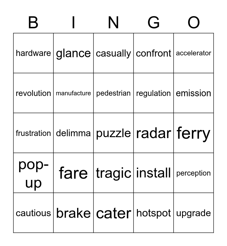This bingo card has a free space and 24 words: fare, brake, pedestrian, cautious, accelerator, hardware, revolution, glance, radar, tragic, regulation, frustration, install, perception, manufacture, hotspot, ferry, casually, emission, delimma, upgrade, pop-up, confront and cater.