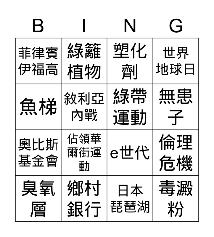 This bingo card has 19 words: e世代, GPS, 塑化劑, 毒澱粉, 倫理 危機, 魚梯, 日本 琵琶湖, 菲律賓 伊福高, 綠籬植物, 奧比斯基金會, 佔領華爾街運動, 敘利亞內戰, 綠帶 運動, 鄉村 銀行, 臭氧層, 國際公平貿易組織, 世界 地球日, 無患子 and 生態 危機.