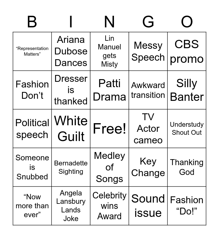 This bingo card has a free space and 24 words: Bernadette Sighting, Angela Lansbury Lands Joke, Patti Drama, “Now more than ever”, CBS promo, “Representation Matters”, Fashion Don’t, Ariana Dubose Dances, TV Actor cameo, Medley of Songs, Awkward transition, Political speech, Key Change, Thanking God, Dresser is thanked, Sound issue, Understudy Shout Out, Lin Manuel gets Misty, Silly Banter, White Guilt, Fashion “Do!”, Someone is Snubbed, Messy Speech and Celebrity wins Award.