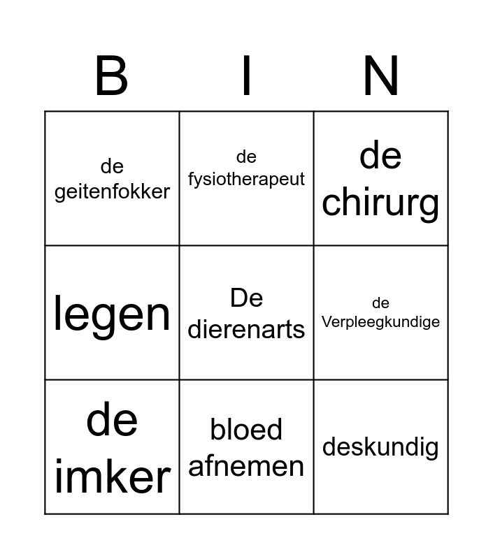 This bingo card has a free space and 8 words: de Verpleegkundige, de chirurg, de fysiotherapeut, de imker, de geitenfokker, deskundig, legen and bloed afnemen.