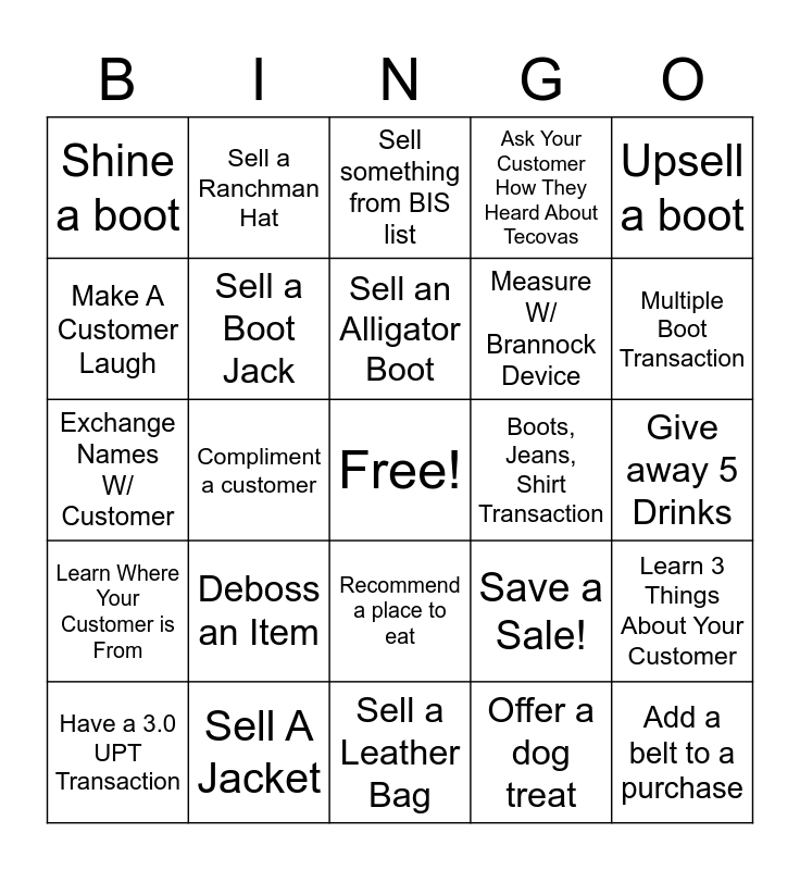 This bingo card has a free space and 27 words: Save a Sale!, Complete a "Ship to Customer" Transaction, Measure W/ Brannock Device, Sell a Leather Bag, Make A Customer Laugh, Sell something from BIS list, Sell a Ranchman Hat, Learn Where Your Customer is From, Boots, Jeans, Shirt Transaction, Learn 3 Things About Your Customer, Exchange Names W/ Customer, Ask Your Customer How They Heard About Tecovas, Have a 3.0 UPT Transaction, Sell A Jacket, Multiple Boot Transaction, Sell A Boot Tree, Sell a Boot Jack, Sell an Alligator Boot, Deboss an Item, Shine a boot, Give away 5 Drinks, Offer a dog treat, Compliment a customer, Add a belt to a purchase, Recommend a place to eat, Upsell a boot and Sell a blanket.