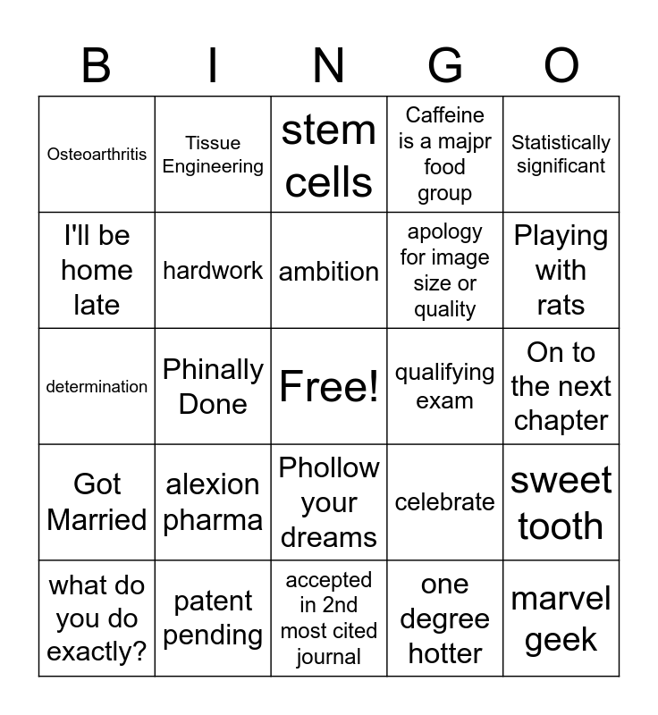 This bingo card has a free space and 28 words: sweet tooth, are there any more questions, apology for image size or quality, one degree hotter, I'll be home late, stem cells, Tissue Engineering, Got Married, qualifying exam, what do you do exactly?, determination, Caffeine is a majpr food group, patent pending, accepted in 2nd most cited journal, Playing with rats, First to finish in 4 years, alexion pharma, hardwork, ambition, Phollow your dreams, Osteoarthritis, Free food in the break room, marvel geek, Phinally Done, On to the next chapter, celebrate, Statistically significant and Published 6 Papers.