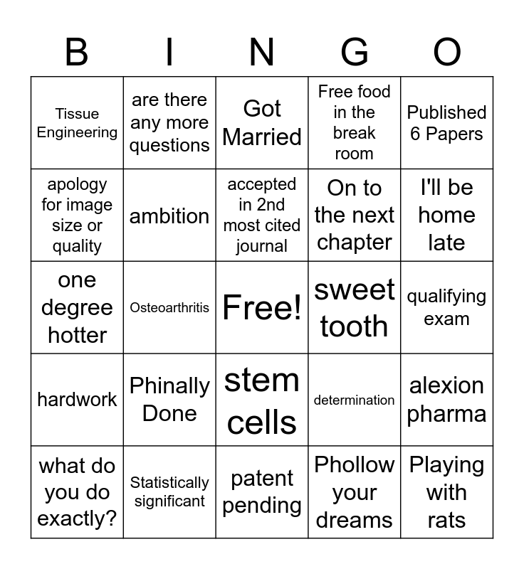 This bingo card has a free space and 28 words: alexion pharma, celebrate, On to the next chapter, Phollow your dreams, apology for image size or quality, Got Married, are there any more questions, hardwork, sweet tooth, what do you do exactly?, one degree hotter, Free food in the break room, Statistically significant, patent pending, I'll be home late, marvel geek, Phinally Done, ambition, accepted in 2nd most cited journal, stem cells, Tissue Engineering, Caffeine is a majpr food group, Playing with rats, Osteoarthritis, qualifying exam, determination, Published 6 Papers and First to finish in 4 years.