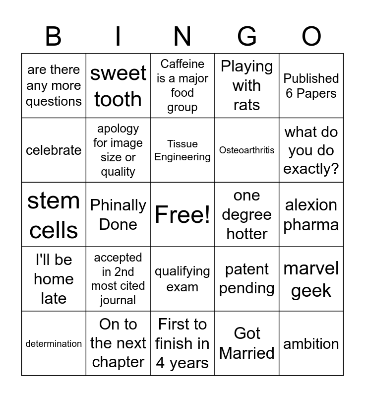 This bingo card has a free space and 28 words: marvel geek, Free food in the break room, Osteoarthritis, Got Married, celebrate, Caffeine is a major food group, sweet tooth, I'll be home late, one degree hotter, determination, stem cells, Playing with rats, On to the next chapter, First to finish in 4 years, what do you do exactly?, hardwork, accepted in 2nd most cited journal, apology for image size or quality, Tissue Engineering, qualifying exam, are there any more questions, Statistically significant, ambition, Phinally Done, alexion pharma, patent pending, Published 6 Papers and Phollow your dreams.