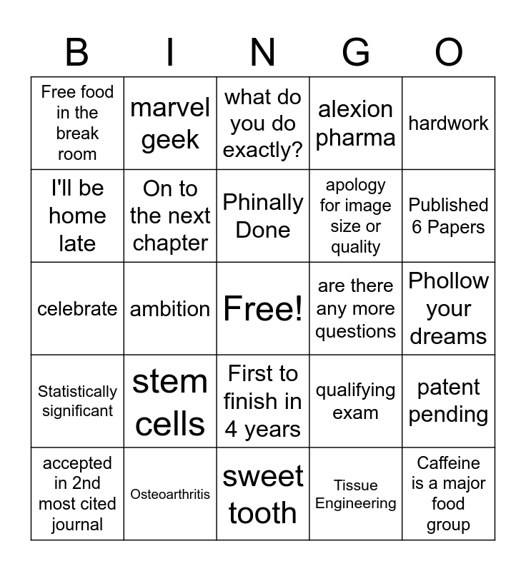 This bingo card has a free space and 28 words: patent pending, one degree hotter, apology for image size or quality, Tissue Engineering, I'll be home late, what do you do exactly?, marvel geek, Statistically significant, are there any more questions, accepted in 2nd most cited journal, celebrate, alexion pharma, Osteoarthritis, sweet tooth, Published 6 Papers, determination, stem cells, On to the next chapter, Phinally Done, First to finish in 4 years, Free food in the break room, Got Married, Caffeine is a major food group, ambition, Phollow your dreams, qualifying exam, hardwork and Playing with rats.