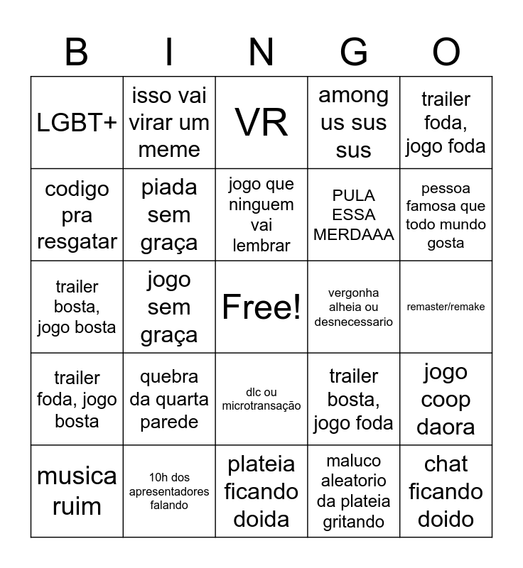 This bingo card has a free space and 29 words: musica ruim, jogo de anime zoado, jogo sem graça, igualdade no mundo dos games, LGBT+, VR, piada sem graça, quebra da quarta parede, vergonha alheia ou desnecessario, 10h dos apresentadores falando, remaster/remake, chat ficando doido, plateia ficando doida, maluco aleatorio da plateia gritando, pessoa famosa que todo mundo gosta, pessoa famosa que ninguém gosta, dlc ou microtransação, trailer foda, jogo bosta, trailer foda, jogo foda, trailer bosta, jogo bosta, trailer bosta, jogo foda, FINALMENTE, PULA ESSA MERDAAA, codigo pra resgatar, among us sus sus, isso vai virar um meme, jogo coop daora, jogo que ninguem vai lembrar and WORLD PREMIERE.