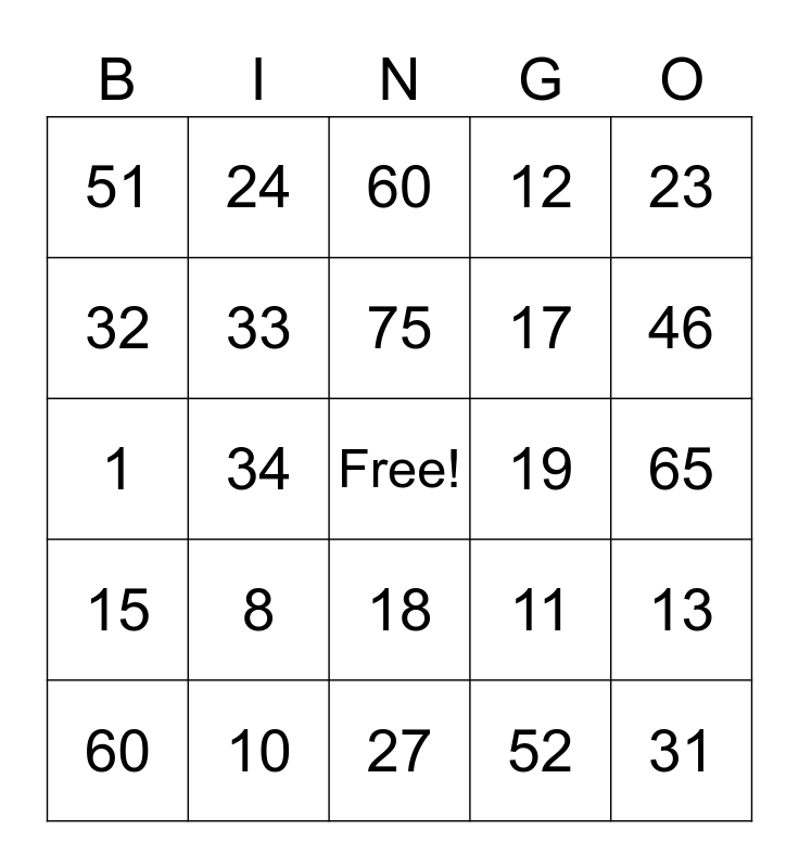 This bingo card has a free space and 24 words: 8, 10, 75, 60, 23, 51, 32, 24, 19, 18, 17, 1, 11, 13, 33, 52, 65, 60, 46, 34, 31, 15, 12 and 27.