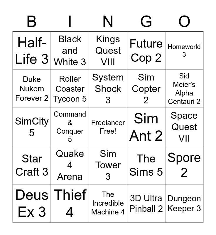This bingo card has a free space and 24 words: Quake 4 Arena, Thief 4, System Shock 3, Deus Ex 3, Homeworld 3, Half-Life 3, Duke Nukem Forever 2, Black and White 3, Sim Ant 2, Sim Tower 3, Sim Copter 2, SimCity 5, The Sims 5, Spore 2, Roller Coaster Tycoon 5, 3D Ultra Pinball 2, Space Quest VII, Kings Quest VIII, Sid Meier's Alpha Centauri 2, Command & Conquer 5, Dungeon Keeper 3, Star Craft 3, Future Cop 2 and The Incredible Machine 4.