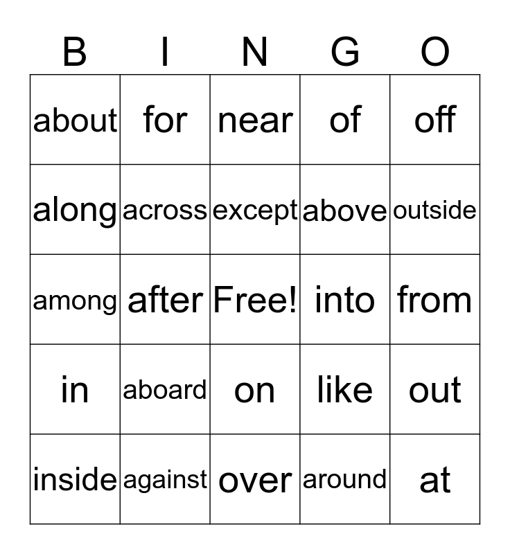 This bingo card has a free space and 24 words: aboard, against, except, inside, off, about, along, for, into, on, above, among, like, out, across, around, from, near, outside, after, at, in, of and over.