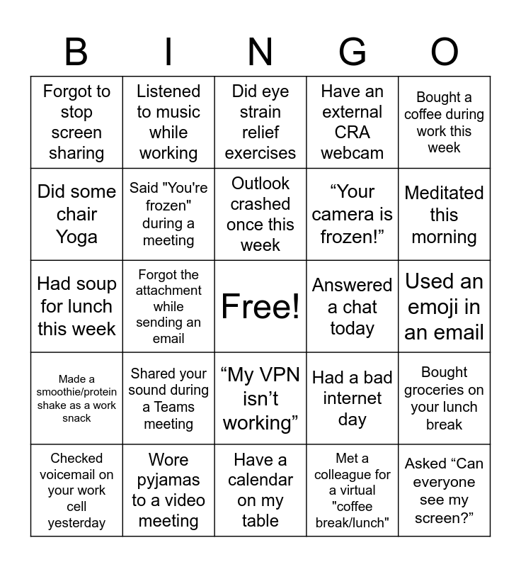 This bingo card has a free space and 75 words: VPN crashed once in the last two weeks, Forgot my LAN password on Monday, Outlook crashed once this week, Had a scheduled re-entry this week, Ordered offices supplies in June, Sent an email to the wrong employee before, Have your meeting interrupted by a pet, Participated in last year’s CRA Charitable Campaign, Loves National Public Service Week, Sent a Thank You certificate, Updated my Mobility Bank Profile, Nominated someone for an Award of Excellence, “My VPN isn’t working”, “Your camera is frozen!”, Called IT once this week, Did some chair Yoga, Wore pyjamas to a video meeting, Talked out loud to yourself, Replied with “lol: and actually laughed, Meditated this morning, Joked about how long commute was, Listened to music while working, Have a calendar on my table, Have an external CRA webcam, Bought a coffee during work this week, Laptop restarted for updates this week, Made an uber eats order during work this month, Got a message saying your outlook is getting full, Drank a glass of water, Stretched this morning, Hit snooze more than once this morning, Did household chores on your lunch break, A bird flew into my window, Had a bad internet day, Used an emoji in an email, Forgot to stop screen sharing, Customized background on a video call, Spotted a pet in the background of a meeting, Answered a chat today, Asked “Can everyone see my screen?”, Said “Sorry – I was on mute”, Said “Can you hear me?”, Said “No, it’s still loading”, Said “Next slide please”, Said “Sorry, I’m having connection issues”, Phone ran out of battery during a call, Forgot the attachment while sending an email, Did eye strain relief exercises, Completed everything on your work to-do list yesterday, Had a cup of tea during a call/meeting, Currently working from the sofa, Said "You're frozen" during a meeting, Misses working in the office, Actually saw a co-worker in person, Worked from backyard, porch or balcony, Drank a coffee on a teams call, Only heard every 5th word but got the gist, Worked with a pet on your lap, Lost VPN while presenting, Walked the dog on your lunch break, Checked voicemail on your work cell yesterday, Have a post it note(s) on your laptop/desktop screen, Wore shorts during work once this week, Took written notes down during a meeting, Completed an online course through CSPS this week, Had soup for lunch this week, Went for a walk after work once this week, Did the dishes on your break, Worked with the window open, Bought groceries on your lunch break, Made a smoothie/protein shake as a work snack, Shared your sound during a Teams meeting, Logged into ISS/Candidate Profile, Met a colleague for a virtual "coffee break/lunch" and Used the IT online chat feature.