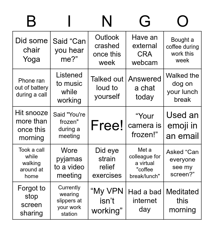 This bingo card has a free space and 82 words: VPN crashed once in the last two weeks, Forgot my LAN password on Monday, Outlook crashed once this week, Had a scheduled re-entry this week, Ordered offices supplies in June, Sent an email to the wrong employee before, Have your meeting interrupted by a pet, Participated in last year’s CRA Charitable Campaign, Loves National Public Service Week, Sent a Thank You certificate, Updated my Mobility Bank Profile, Nominated someone for an Award of Excellence, “My VPN isn’t working”, “Your camera is frozen!”, Called IT once this week, Did some chair Yoga, Wore pyjamas to a video meeting, Talked out loud to yourself, Replied with “lol: and actually laughed, Meditated this morning, Joked about how long commute was, Listened to music while working, Have a calendar on my table, Have an external CRA webcam, Bought a coffee during work this week, Laptop restarted for updates this week, Made an uber eats order during work this month, Got a message saying your outlook is getting full, Drank a glass of water, Stretched this morning, Hit snooze more than once this morning, Did household chores on your lunch break, A bird flew into my window, Had a bad internet day, Used an emoji in an email, Forgot to stop screen sharing, Customized background on a video call, Spotted a pet in the background of a meeting, Answered a chat today, Asked “Can everyone see my screen?”, Said “Sorry – I was on mute”, Said “Can you hear me?”, Said “No, it’s still loading”, Said “Next slide please”, Said “Sorry, I’m having connection issues”, Phone ran out of battery during a call, Forgot the attachment while sending an email, Did eye strain relief exercises, Completed everything on your work to-do list yesterday, Had a cup of tea during a call/meeting, Currently working from the sofa, Said "You're frozen" during a meeting, Misses working in the office, Actually saw a co-worker in person, Worked from backyard, porch or balcony, Drank a coffee on a teams call, Only heard every 5th word but got the gist, Worked with a pet on your lap, Lost VPN while presenting, Walked the dog on your lunch break, Checked voicemail on your work cell yesterday, Have a post it note(s) on your laptop/desktop screen, Wore shorts during work once this week, Took written notes down during a meeting, Completed an online course through CSPS this week, Had soup for lunch this week, Went for a walk after work once this week, Did the dishes on your break, Worked with the window open, Bought groceries on your lunch break, Made a smoothie/protein shake as a work snack, Shared your sound during a Teams meeting, Logged into ISS/Candidate Profile, Met a colleague for a virtual "coffee break/lunch", Used the IT online chat feature, Have a fan on your desk, Currently wearing slippers at your work station, Has dark mode on for MS Teams, Knows how to play a musical instrument, Have a work from home playlist, Took a call while walking around at home and Shopped online for yourself this week.
