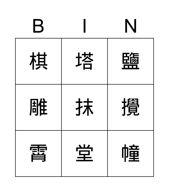 This bingo card has a free space and 8 words: 攪, 鹽, 塔, 霄, 棋, 幢, 雕 and 堂.