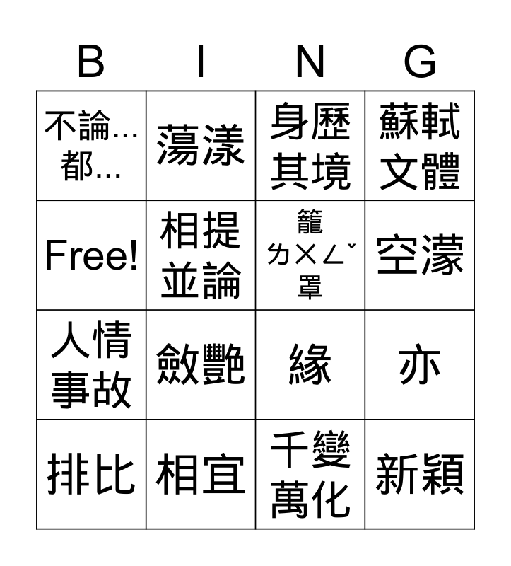 This bingo card has 16 words: 相宜, 亦, 身歷 其境, 不論... 都..., 人情 事故, 蕩漾, 緣, 千變 萬化, Free!, 相提 並論, 排比, 蘇軾 文體, 斂艷, 空濛, 籠 ㄌㄨㄥˇ罩 and 新穎.