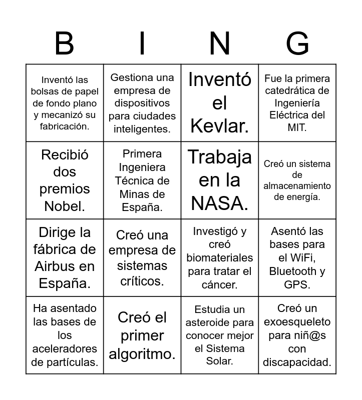 This bingo card has 16 words: Creó el primer algoritmo., Asentó las bases para el WiFi, Bluetooth y GPS., Inventó el Kevlar., Inventó las bolsas de papel de fondo plano y mecanizó su fabricación., Dirige la fábrica de Airbus en España., Gestiona una empresa de dispositivos para ciudades inteligentes., Investigó y creó biomateriales para tratar el cáncer., Estudia un asteroide para conocer mejor el Sistema Solar., Recibió dos premios Nobel., Primera Ingeniera Técnica de Minas de España., Ha asentado las bases de los aceleradores de partículas., Fue la primera catedrática de Ingeniería Eléctrica del MIT., Creó una empresa de sistemas críticos., Creó un sistema de almacenamiento de energía., Trabaja en la NASA. and Creó un exoesqueleto para niñ@s con discapacidad..