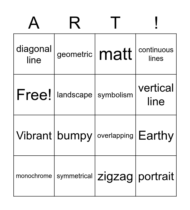This bingo card has 16 words: symmetrical, Earthy, matt, diagonal line, Vibrant, geometric, overlapping, zigzag, Free!, landscape, monochrome, continuous lines, bumpy, vertical line, symbolism and portrait.