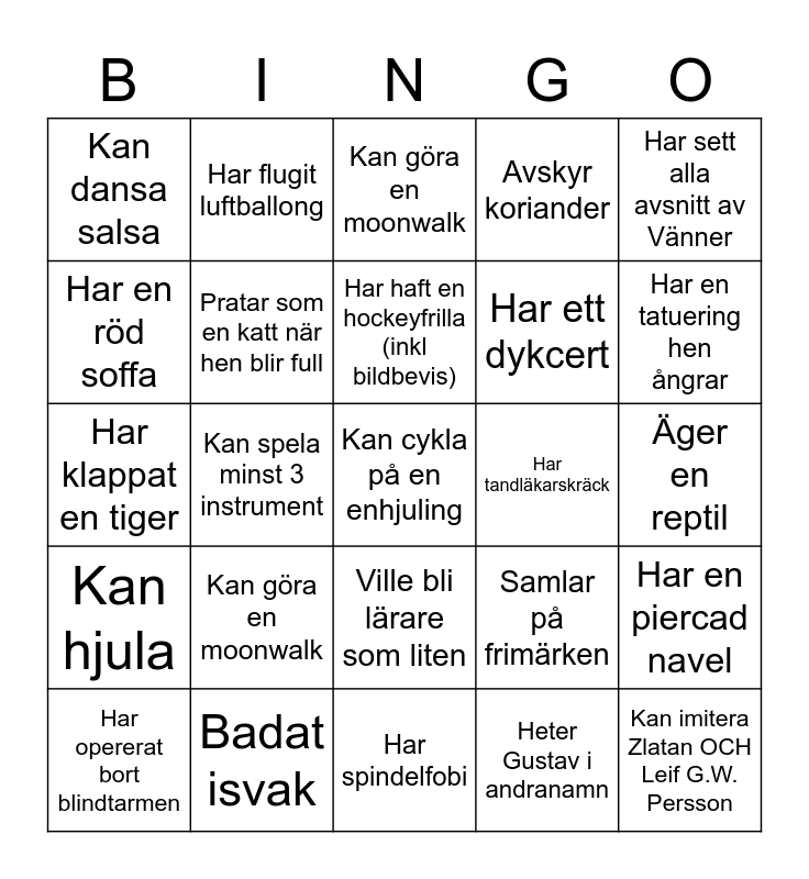 This bingo card has 30 words: Badat isvak, Kan äta en hel citron utan att göra en enda grimas, Kan spela minst 3 instrument, Kan sjunga hela refrängen i Eloise, Kan dansa salsa, Kan göra en moonwalk, Pratar som en katt när hen blir full, Ville bli lärare som liten, Har tandläkarskräck, Har spindelfobi, Äger en reptil, Kan cykla på en enhjuling, Heter Gustav i andranamn, Kan imitera Zlatan OCH Leif G.W. Persson, Har en tatuering hen ångrar, Har en släkting som är äldre än 95 år, Samlar på frimärken, Kan hjula, Kan göra en moonwalk, Har sett alla avsnitt av Vänner, Har klappat en tiger, Har varit i Afrika, Har flugit luftballong, Har ett dykcert, Har en röd soffa, Avskyr koriander, Har en piercad navel, Har opererat bort blindtarmen, Har haft en hockeyfrilla (inkl bildbevis) and Har ätit en tillagad insekt.